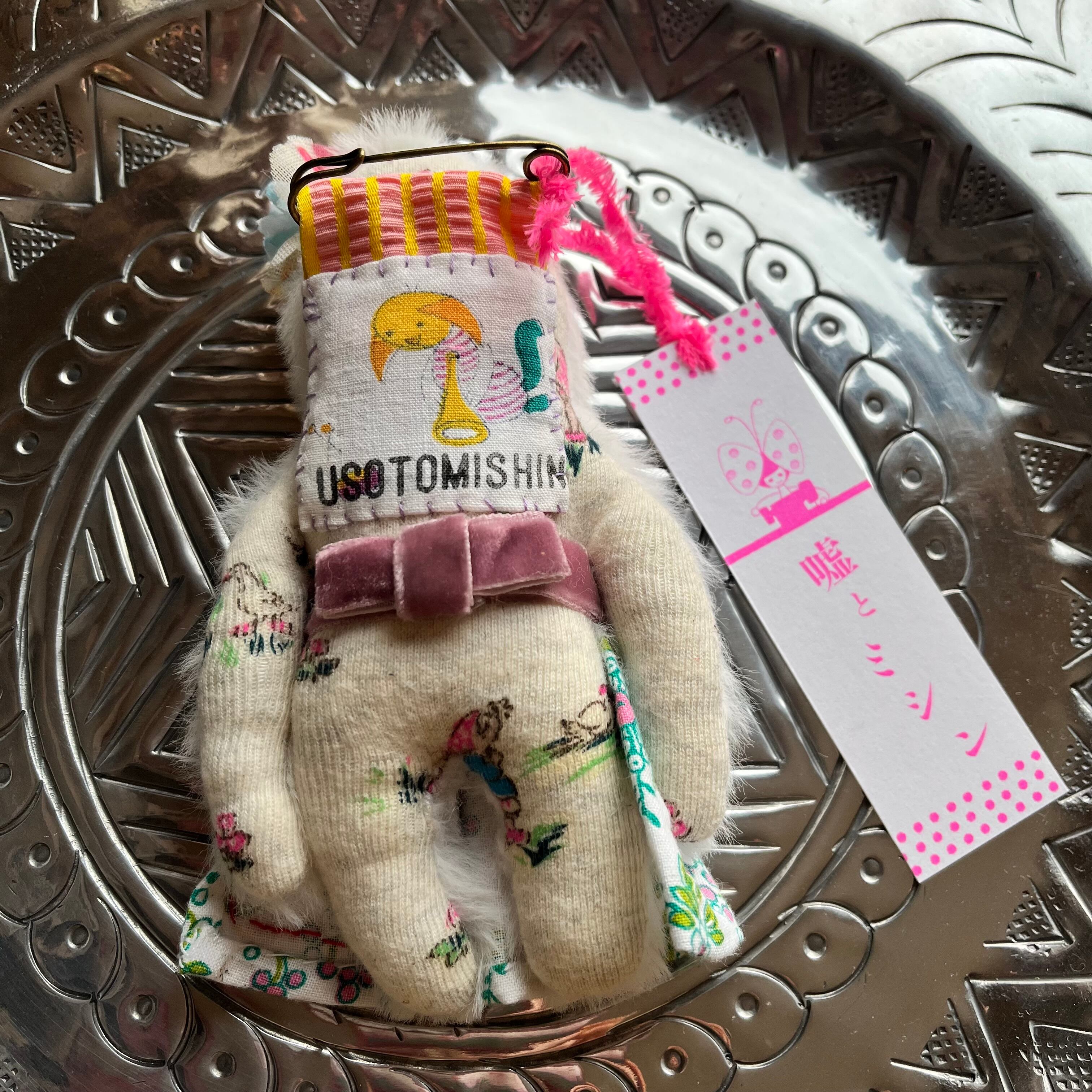 ヴィンテージのタグの上にピンブローチをつけました。