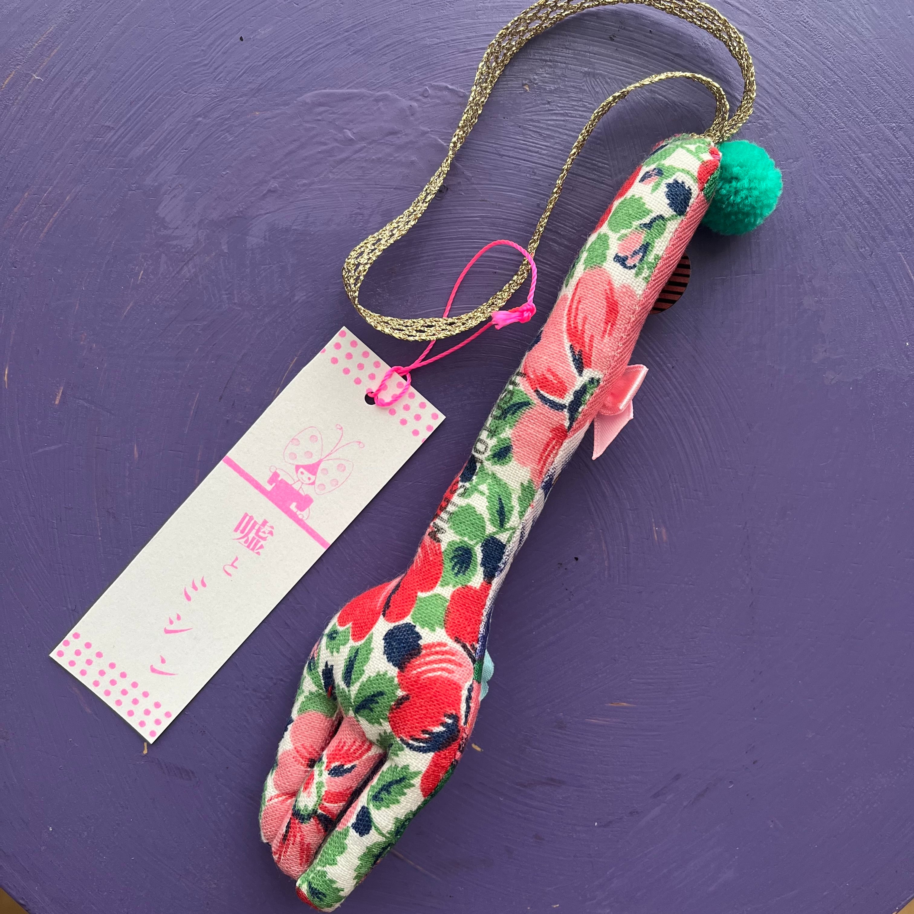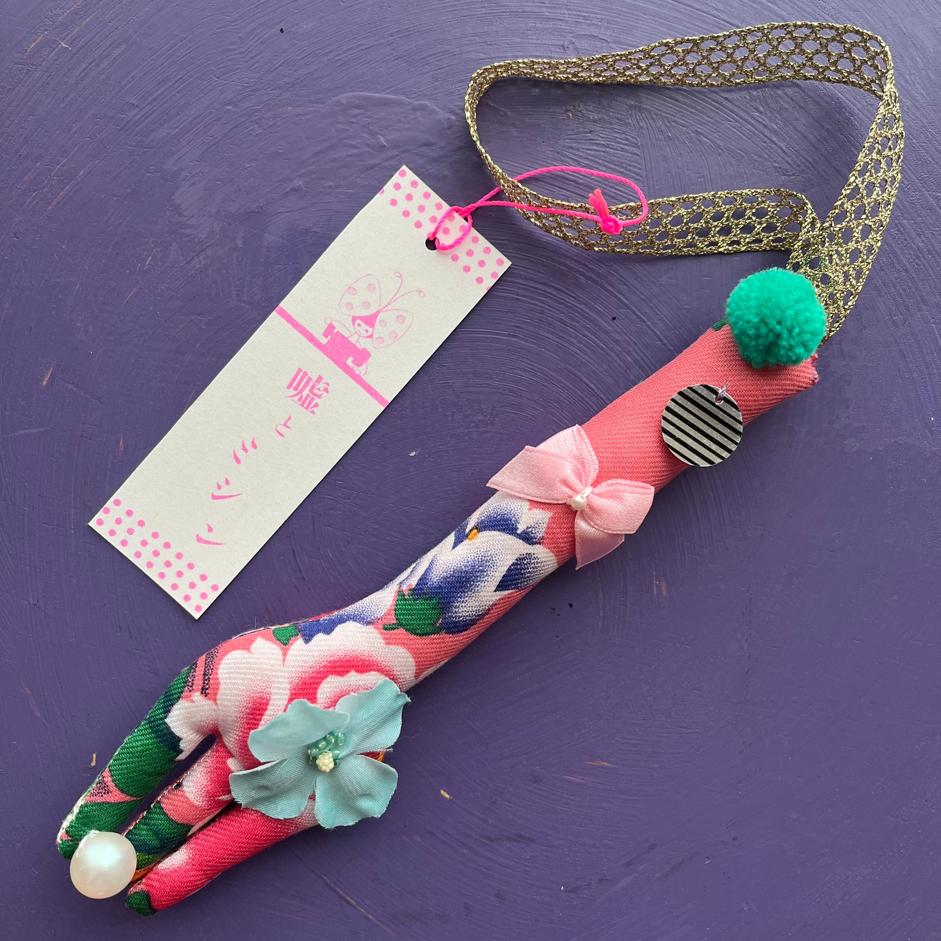 こちらはミルキーピンクの色合いの花柄がキッチュでかわいいフォークチャームです。