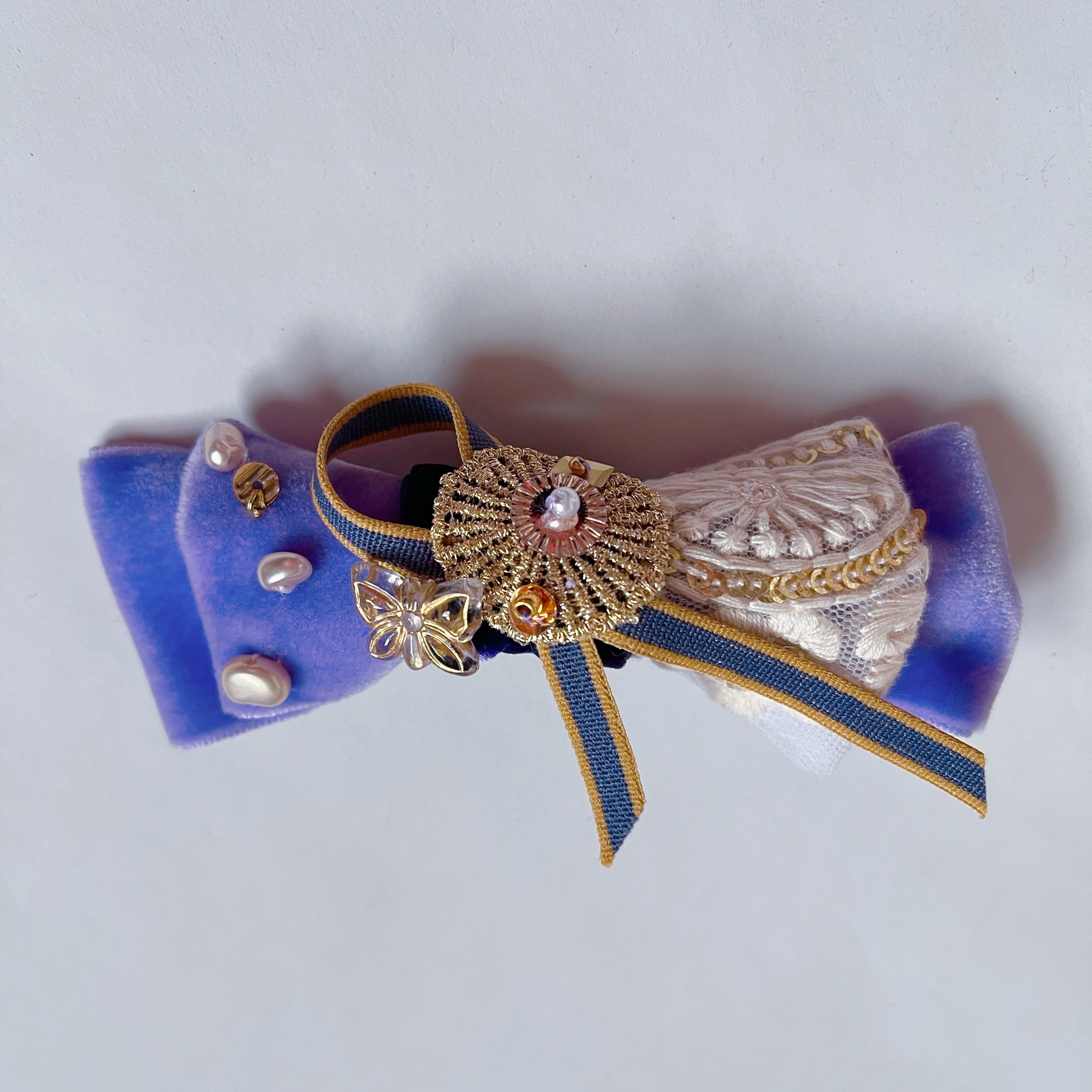 パールや蝶々のビーズなどをランダムに縫い留めた