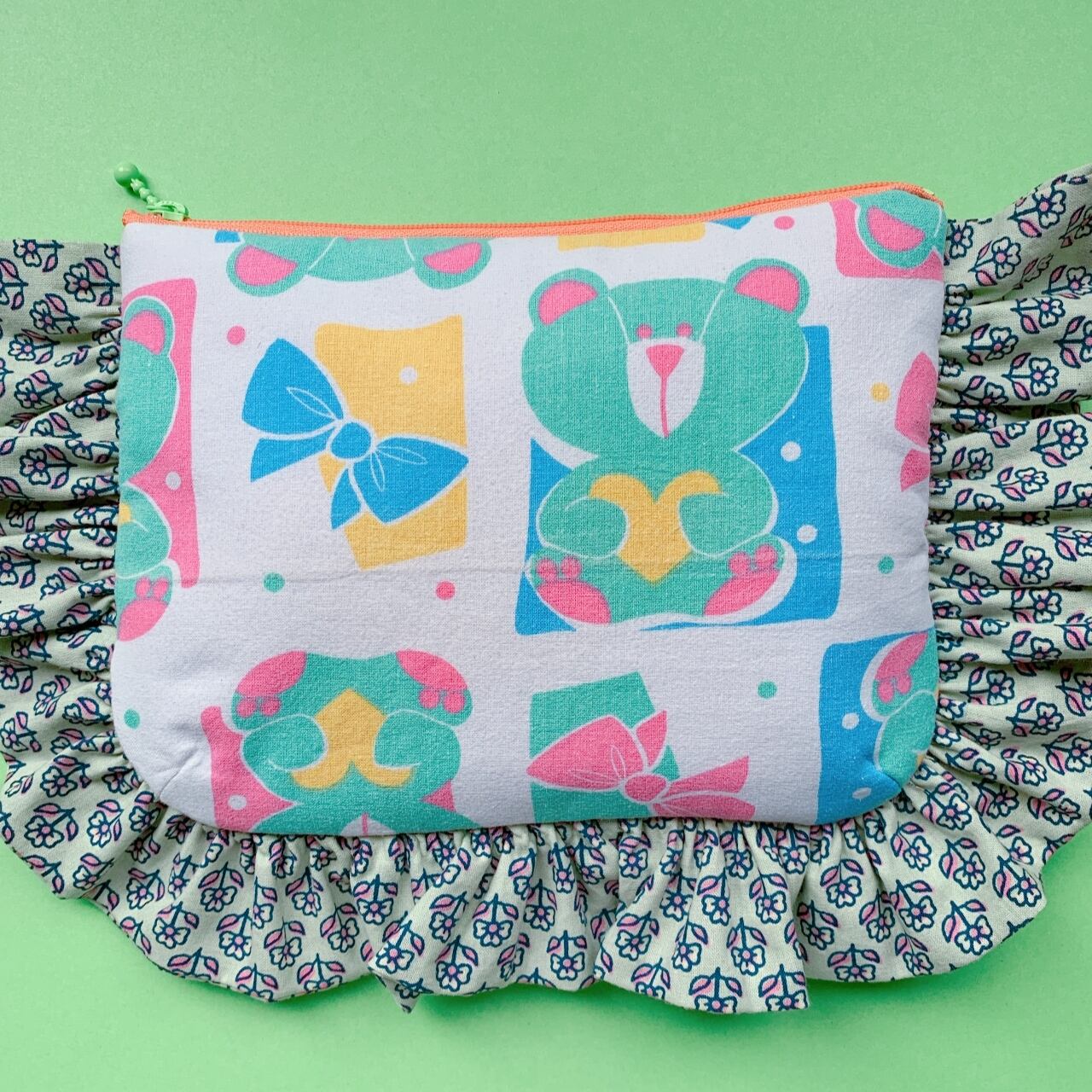 「パステルドリームベア」と名付けたこちらのポーチは、ピンク、ブルー、イエロー、エメラルドグリーンの美しい配色で描かれたクマさんとリボンが何ともドリーミー。