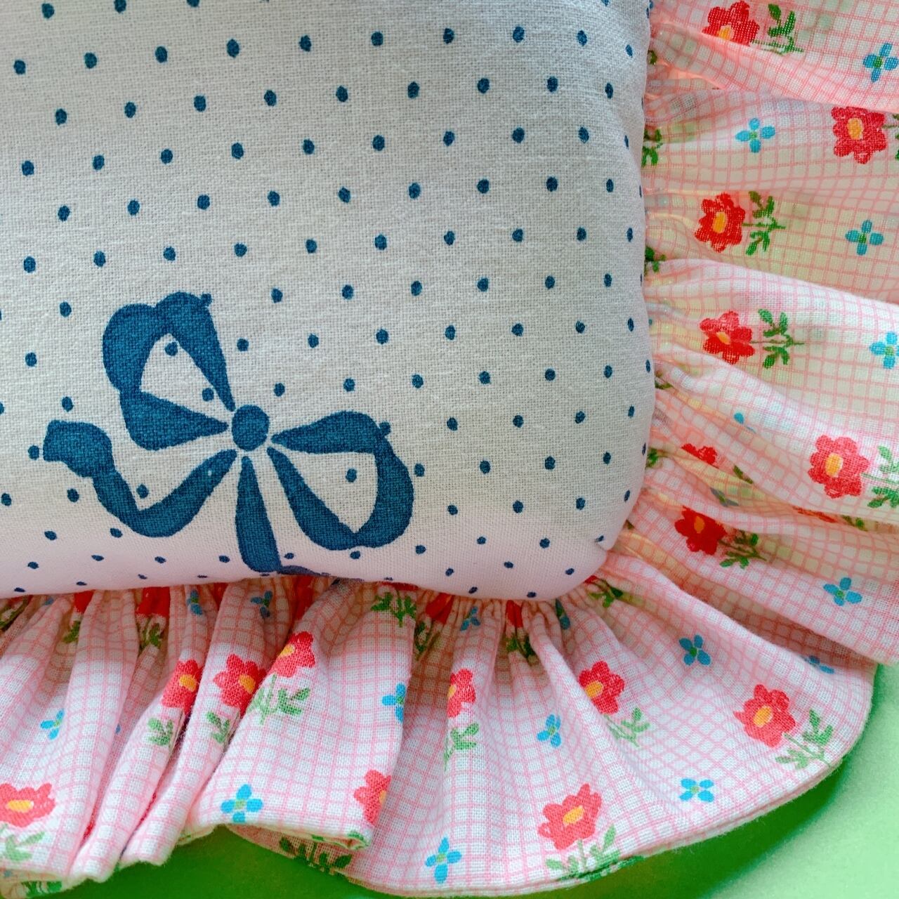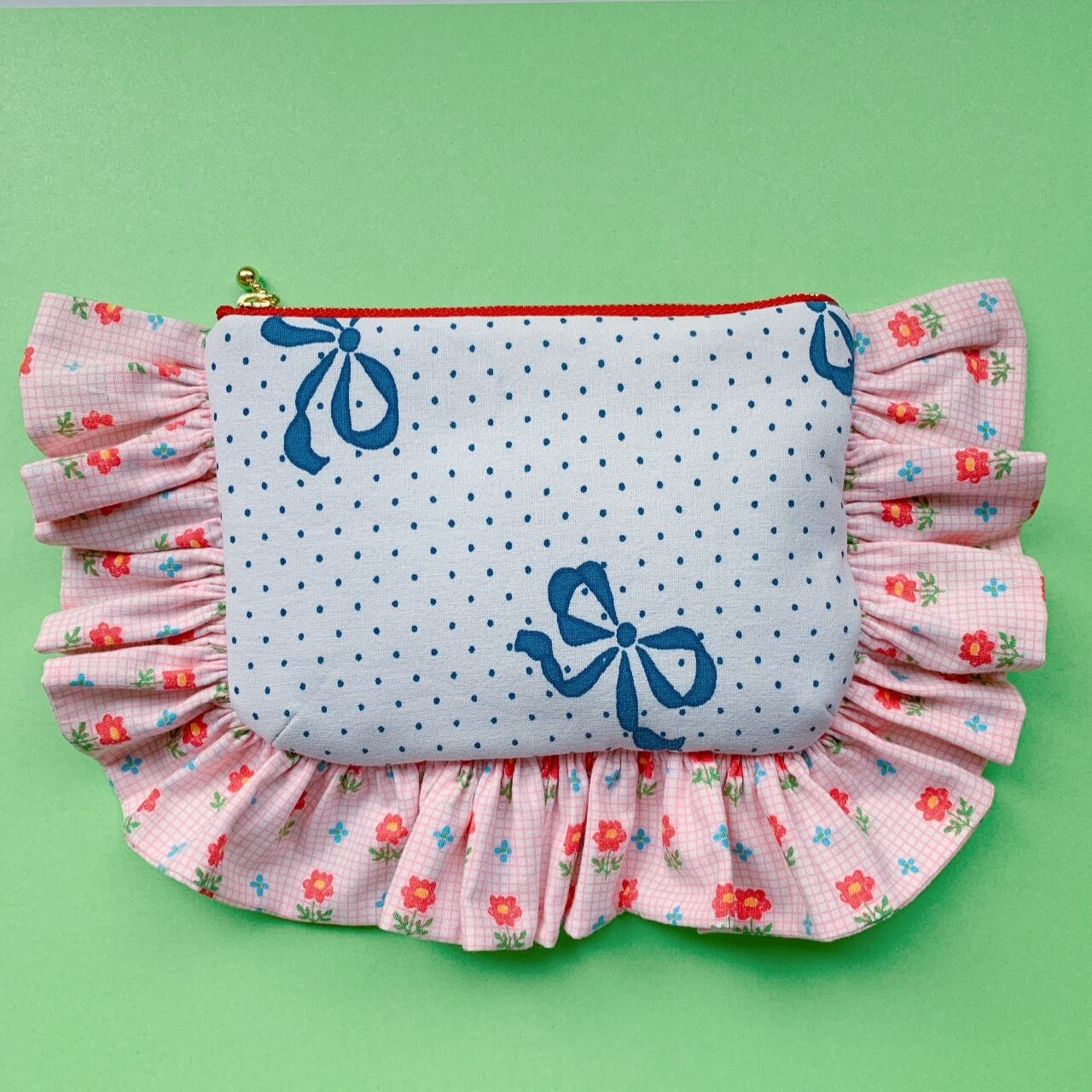 「水玉乙女リボン」と名付けたこちらのポーチ。爽やかなブルーのドットの上にふんわりとリボンが浮かぶ上品な生地。