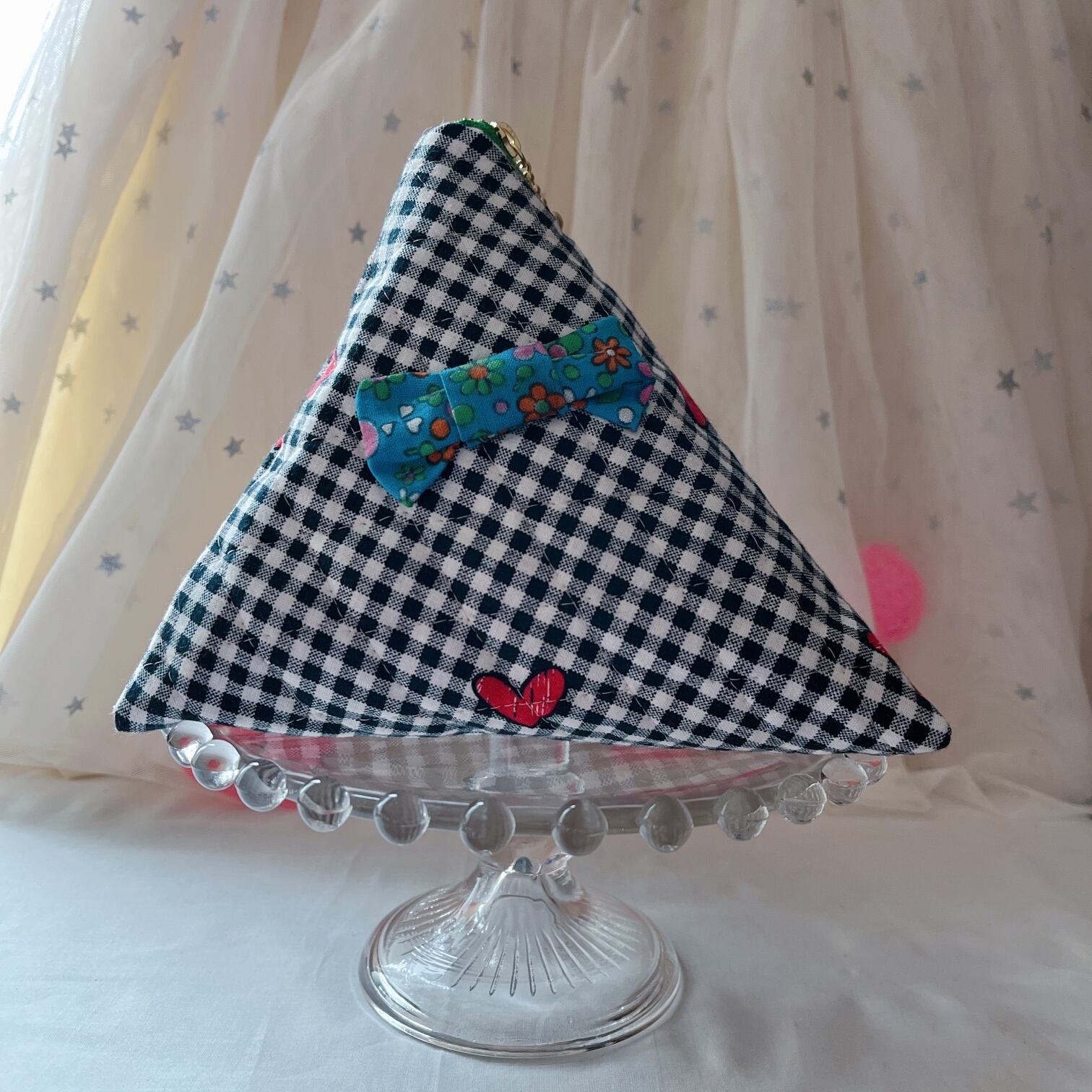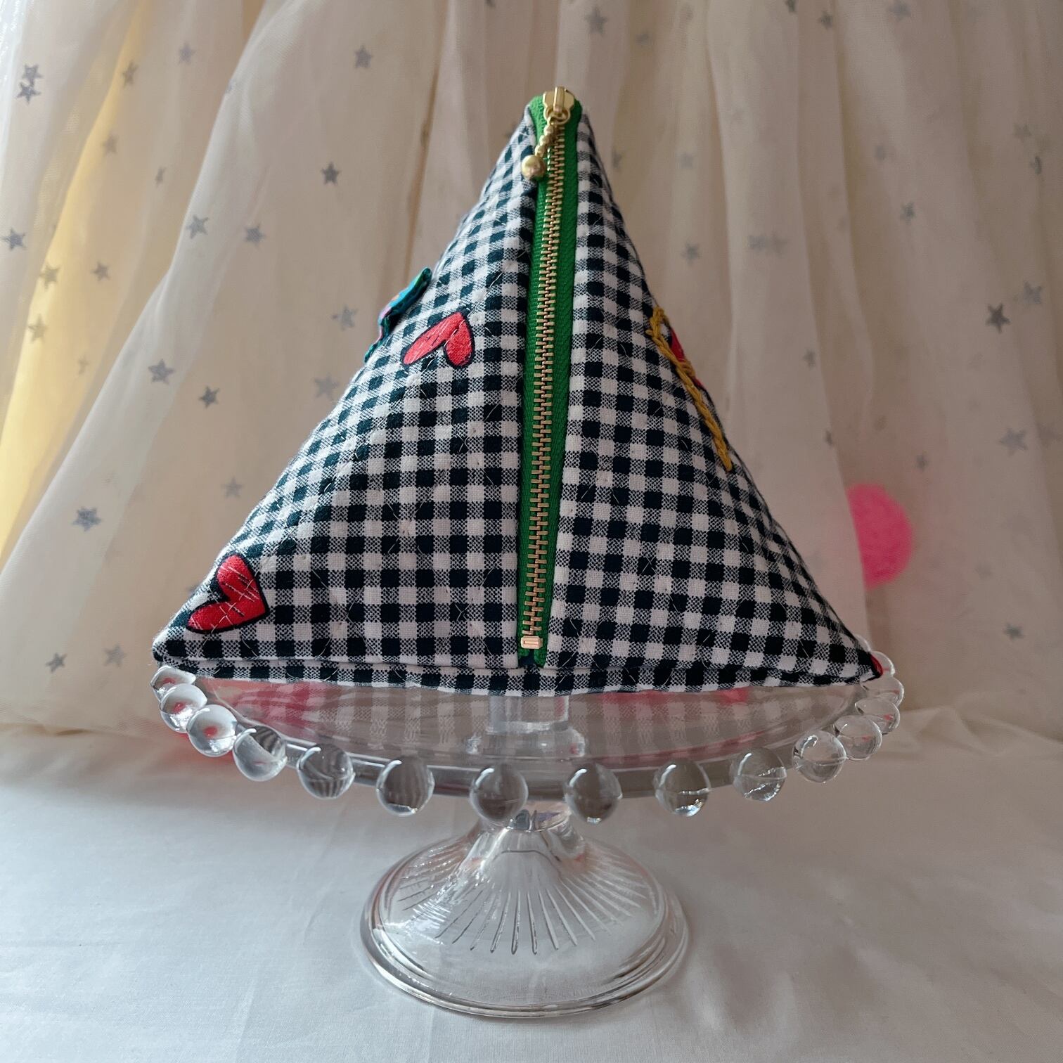 牛乳パックのような三角形の《名前ちゃんポーチ》。