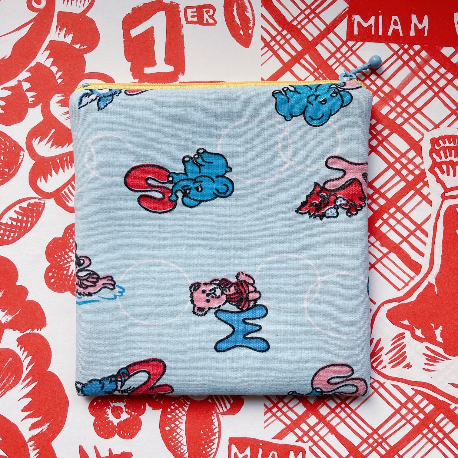 アルファベットを掲げたかわいい動物たちがプリントされた生地。